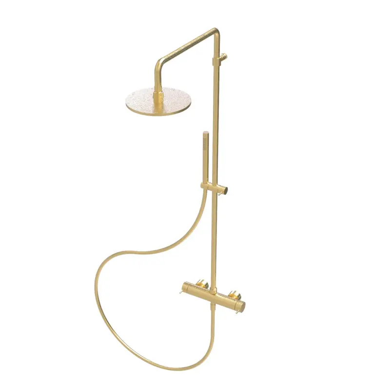 De Waterevolution Flow douchecombinatie met regendouche is een prachtige toevoeging aan elke badkamer. Met zijn messing natuur kleur en design uitstraling brengt deze douchecombinatie een luxe en stijlvolle sfeer in uw douche.